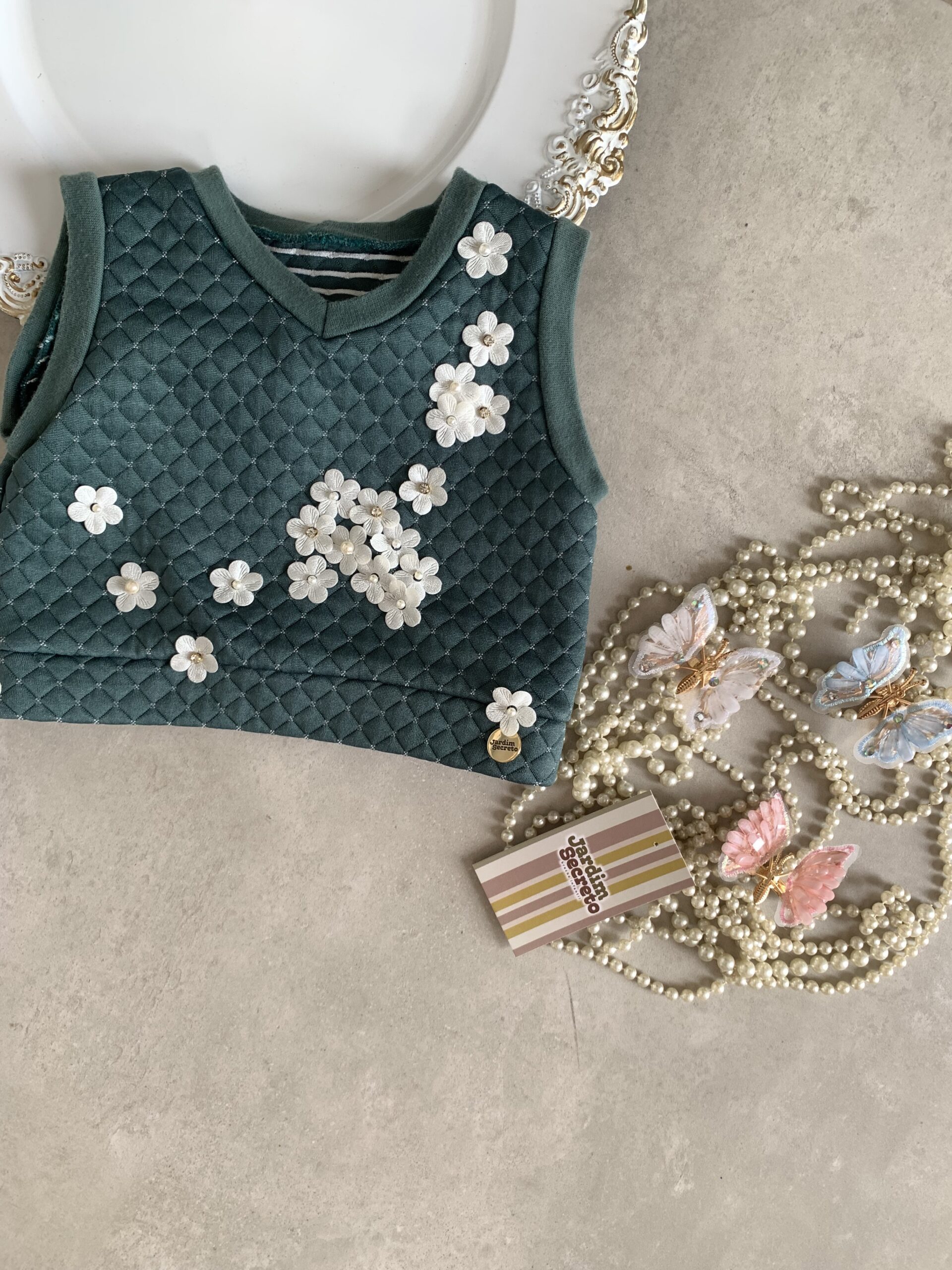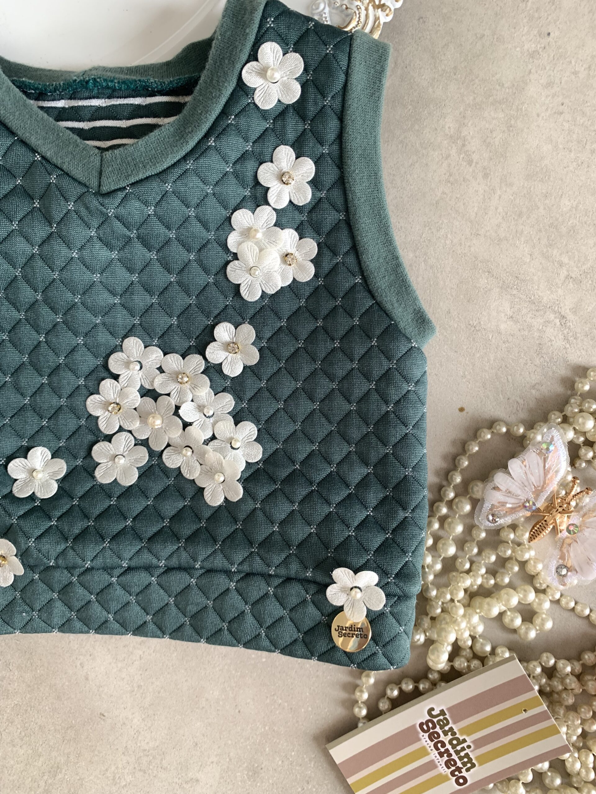 Delicadeza em cada detalhe: o Colete Marina da nossa marca própria Jardim Secreto é uma peça encantadora e cheia de charme. Confeccionado com acabamento encantador, ele traz flores e pérolas bordadas a mão que transformam o look das pequenas. Perfeito para ocasiões especiais ou para dar um toque romântico ao dia a dia, o Colete Marina é uma verdadeira joia do guarda-roupa infantil.